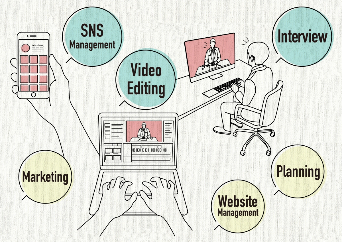 業務内容としては主にYouTubeの動画編集やサイト運営、さらには新たな企画やコンテンツの立案、インスタグラム等のSNSの運用などの業務を行ってもらいます。