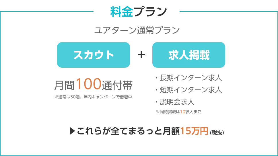 大手ナビサイトを使用していましたが、なかなか学生が集まらず、たまたまお話をいただいたユアターンで4年生向けの説明会の集客していただきました。掲載開始1週間で想定の4倍の学生さんから応募をいただき、とても驚きました!またスカウトでは志望職種で絞り込み、こちらからも10件の返答がありました!
